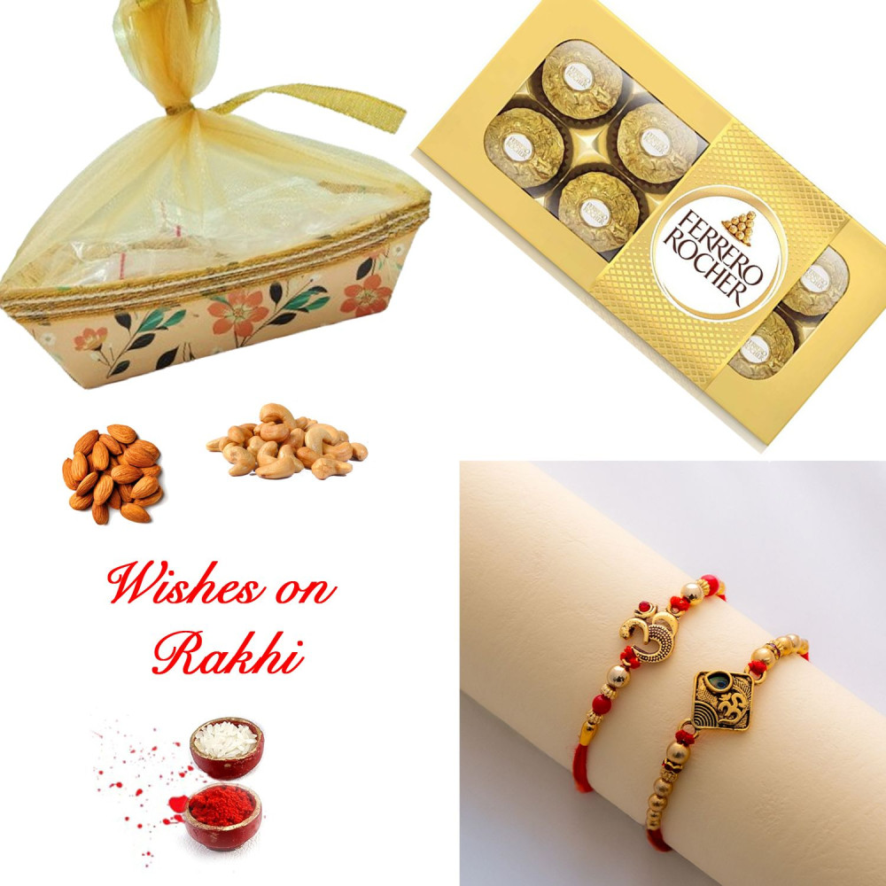 - Captivating Set of 2 Rakhi and Dry Fruits with Ferrero Rocher Treats for this auspicious Raksha Bandhan and Tika.