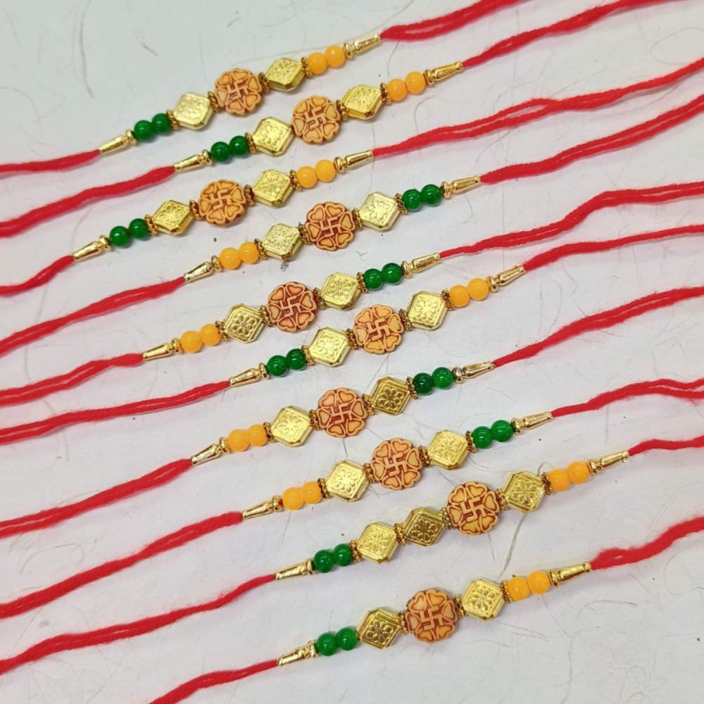 - Colorful Set of 10 Swastik Rakhis with Beads for this auspicious occasion of Raksha Bandhan.