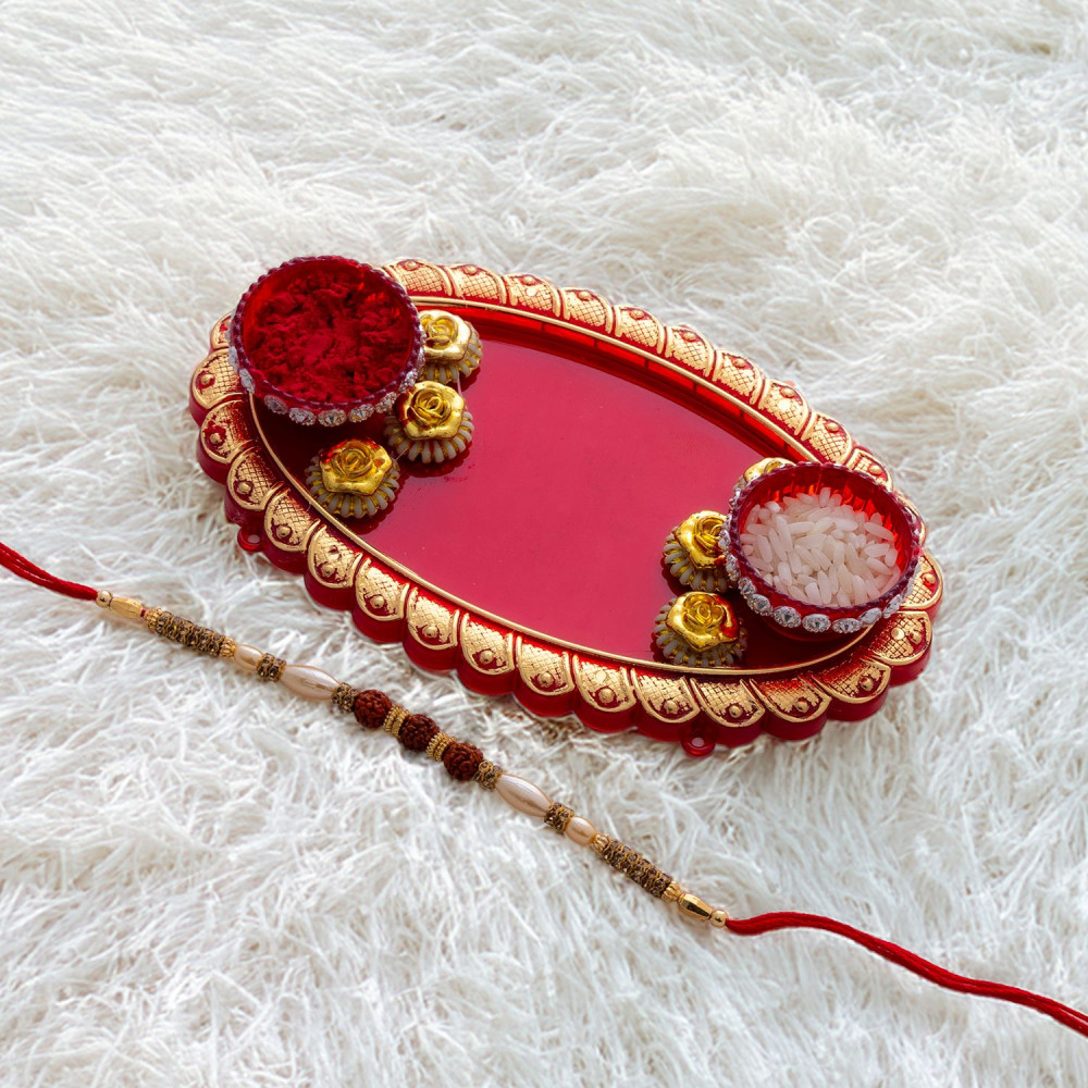 - Custom-Made Rakhi Thali with Exclusive Rudraksh Rakhi for this auspicious Raksha Bandhan and Tika.