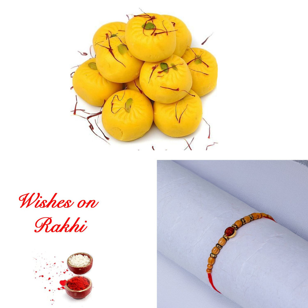 - The set contains - 500 Gms (gross wt.) Kesar Peda, 1 Premium Rakhi, Tilak (Roli + Chawal).