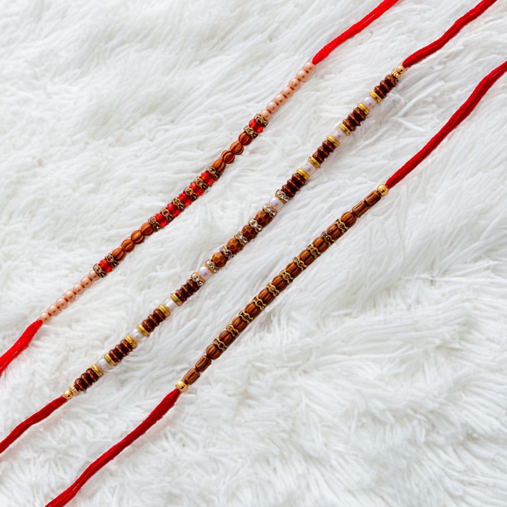 - Exclusive Set of 3 Rakhis with Beads and Pearls for this auspicious occasion of Raksha Bandhan.