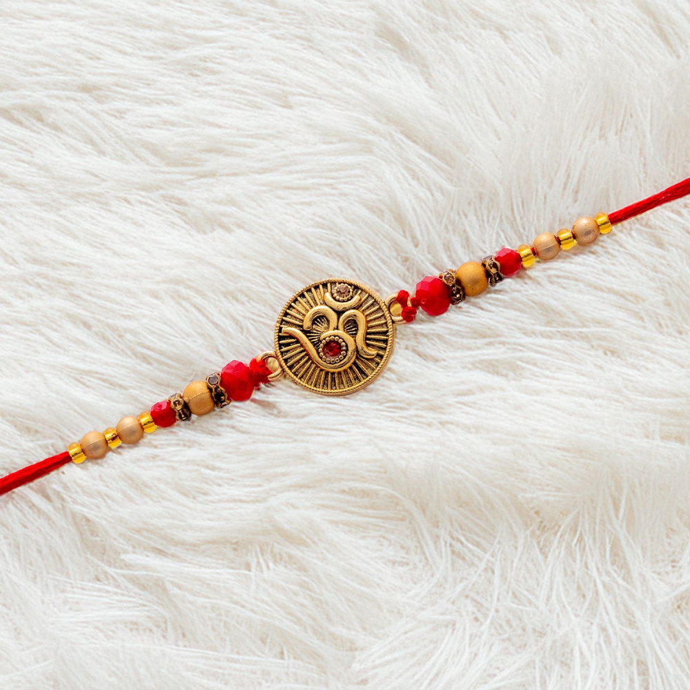 - Handcrafted Beads Rakhi with metallic studded OM for this auspicious Raksha Bandhan to send to your beloved brother with Tika and Chocolate.