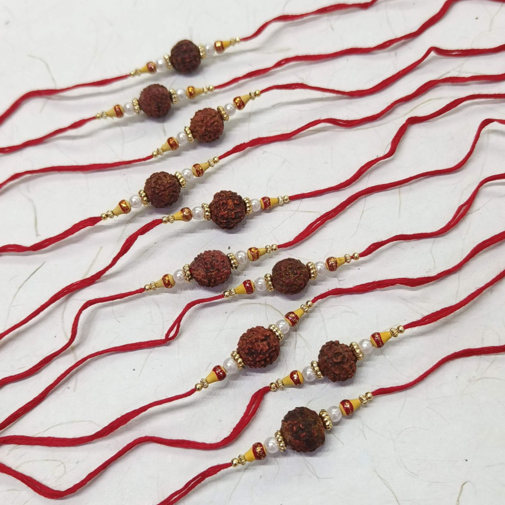 - Handmade Set of 10 Rakhis with Rudraksh and Beads for this auspicious occasion of Raksha Bandhan.