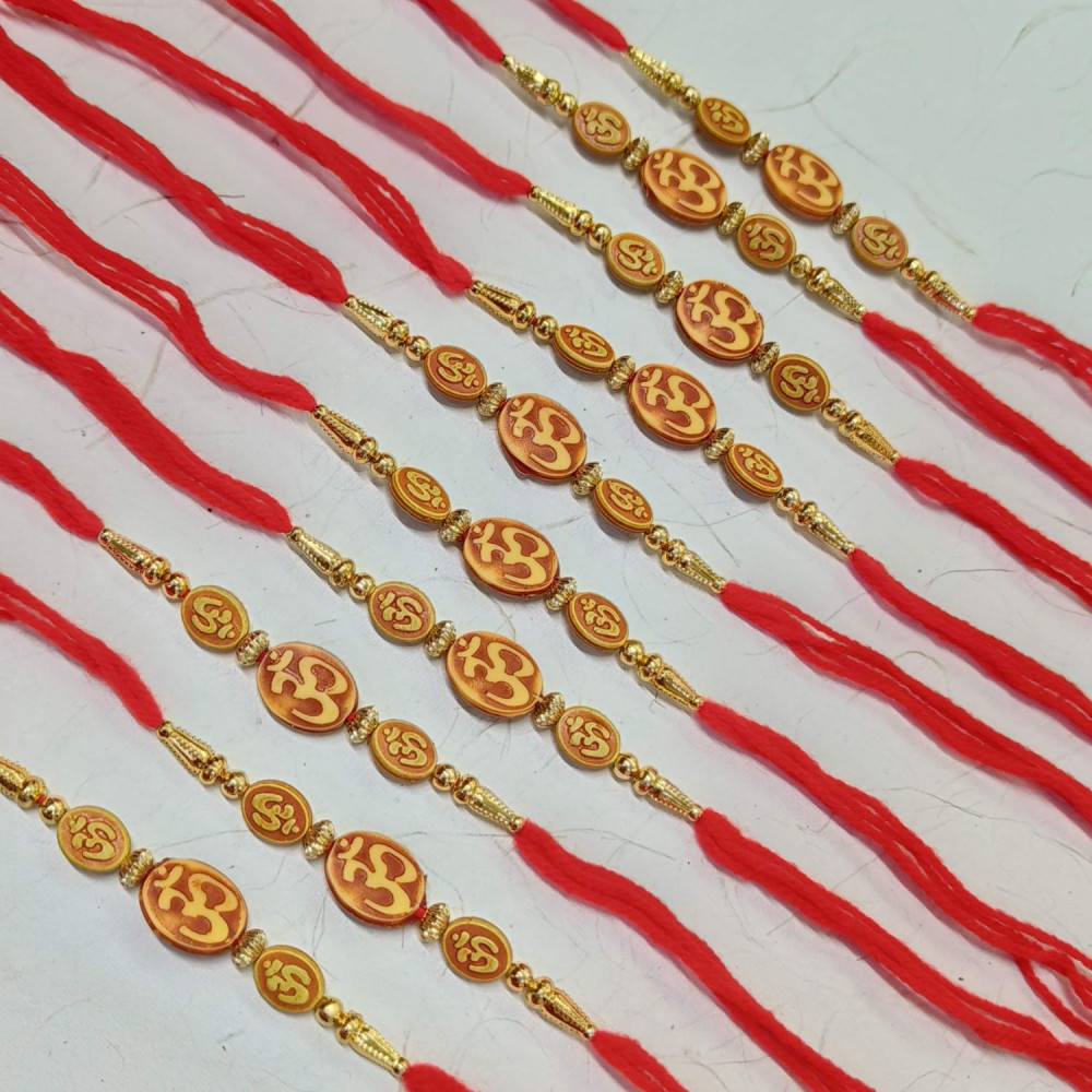 - Lovely Set of 10 OM Rakhis with Golden Beads for this auspicious occasion of Raksha Bandhan.