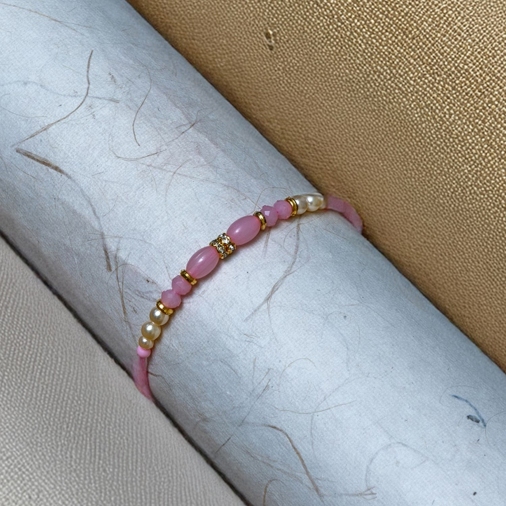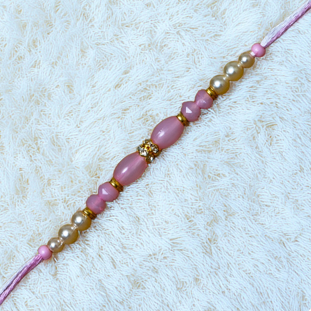 - Pink and White Pearls Rakhi for this auspicious Raksha Bandhan to send to your beloved brother with Tika and Chocolate.