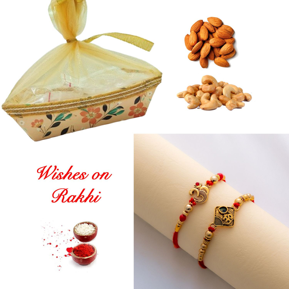 - The set contains - 200 Gms. Cashews and 200 Gms. Almonds in a Decorative Basket, 2 Premium Handcrafted Rakhi for Bhaiya and Tilak ( Roli + Chawal ).