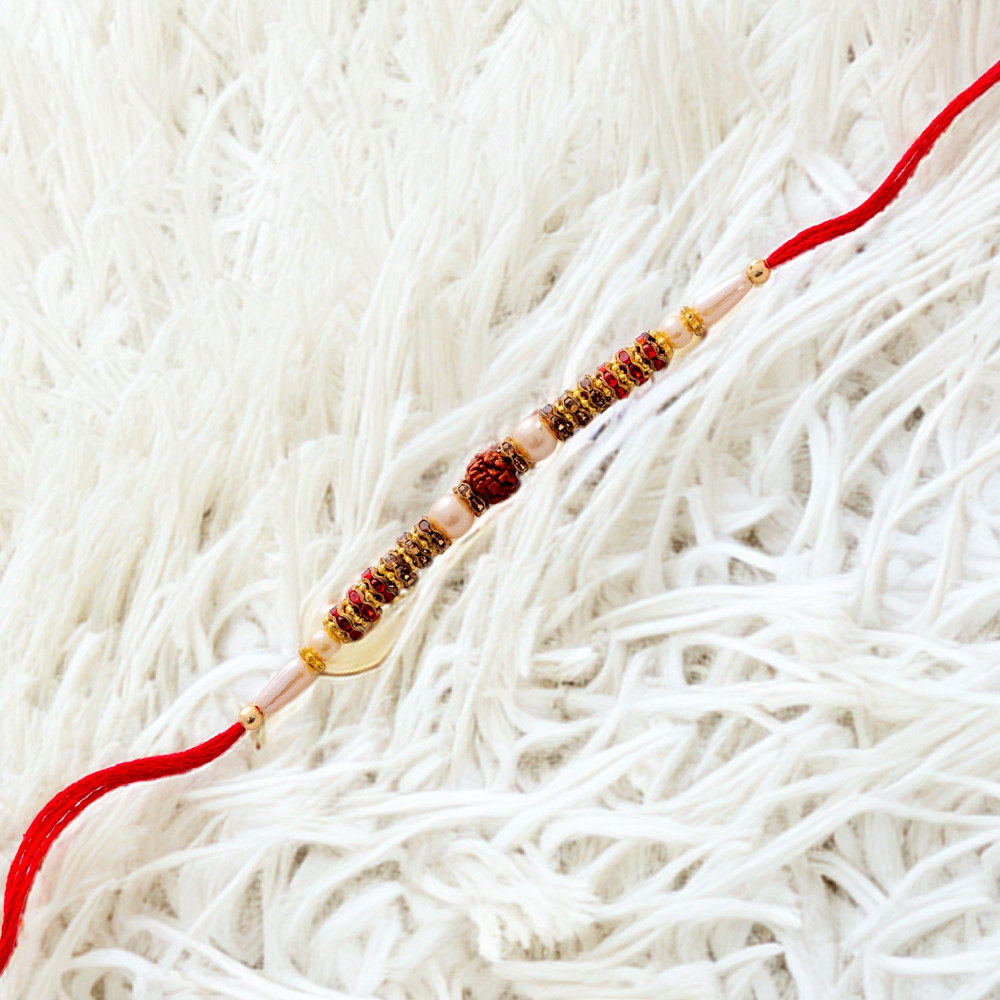 - Rudraksha with pearls and colorful stones Rakhi for this auspicious Raksha Bandhan to send to your beloved brother with Tika and Chocolate.