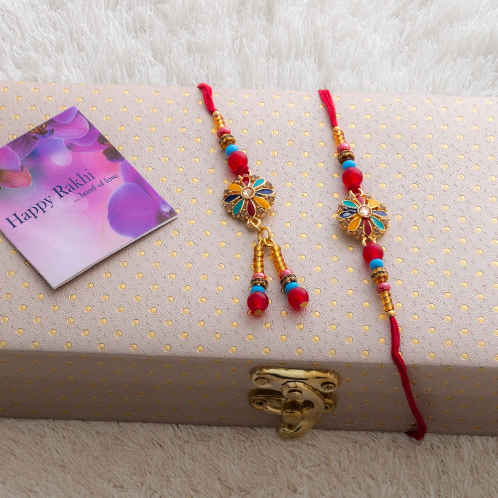 - The set contains - 1 Decorative Box, 1 Premium Handcrafted Rakhi for Bhaiya : 1 Lumba Rakhi for Bhabhi, Tilak ( Roli + Chawal ) and 1 Free Branded Chocolate Bar (5.5 gms)