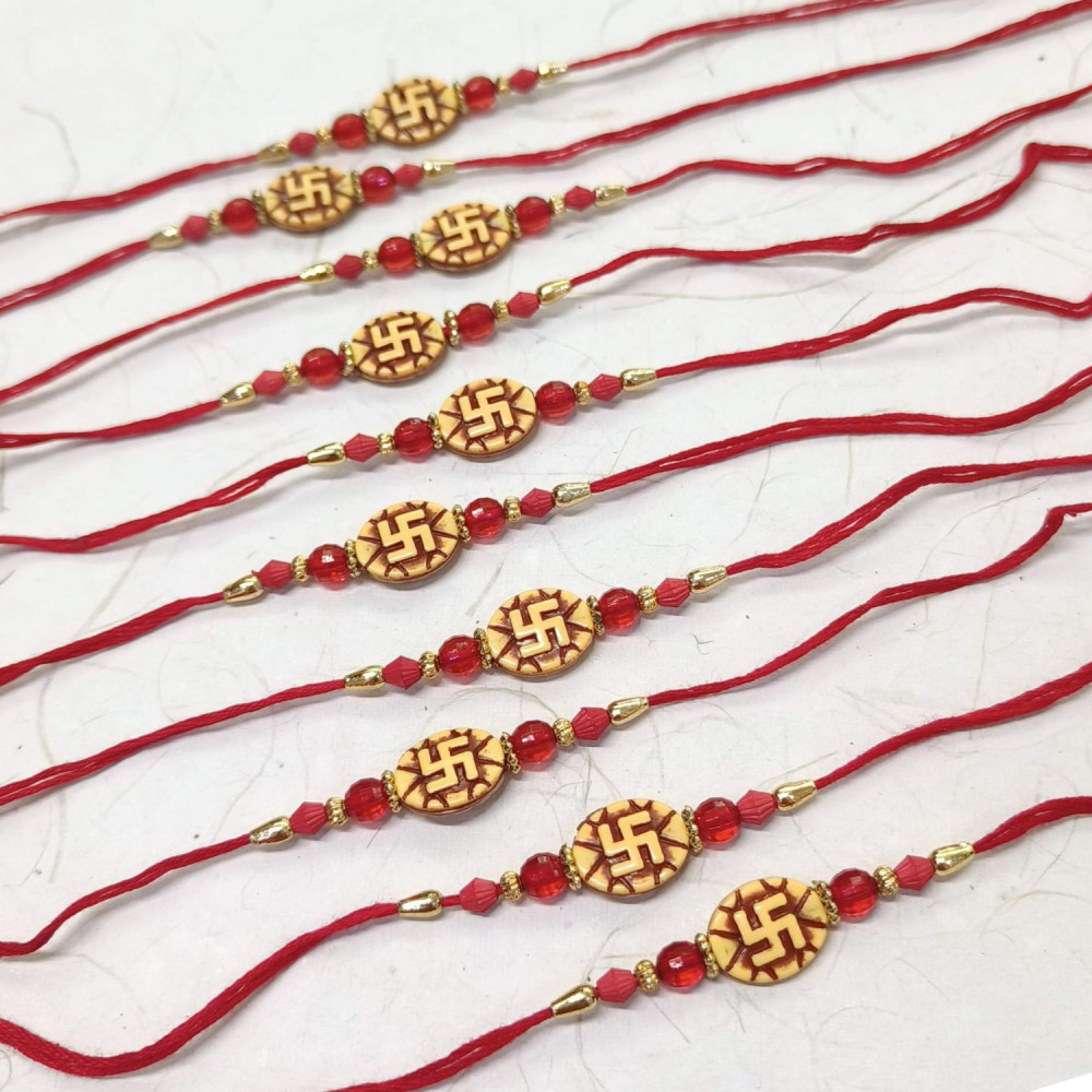 - Traditional Set of 10 Swastik Rakhis with Red and Golden Beads for this auspicious occasion of Raksha Bandhan.