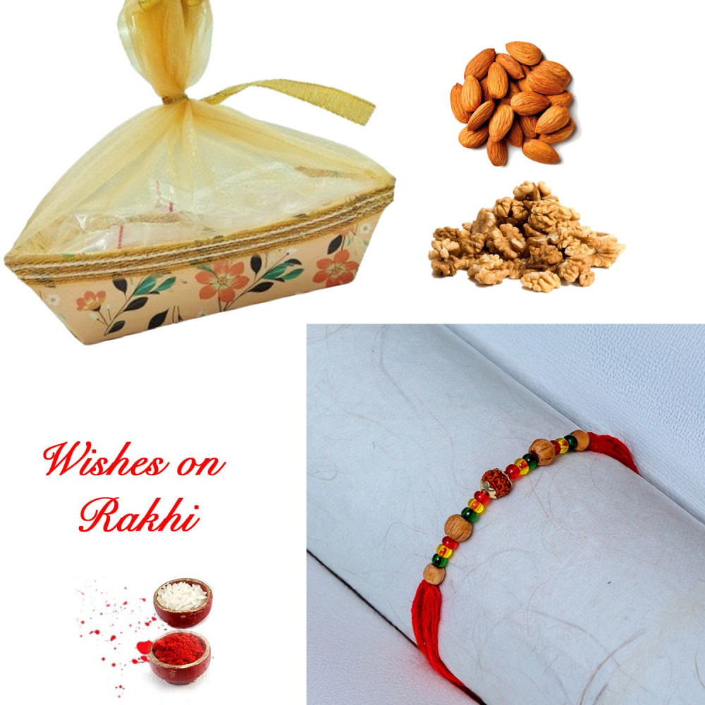 - The set contains - 200 Gms. Almonds and 200 Gms. Walnuts in a Decorative Basket, 1 Premium Handcrafted Rakhi for Bhaiya and Tilak ( Roli + Chawal ).